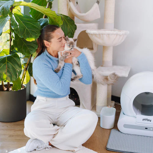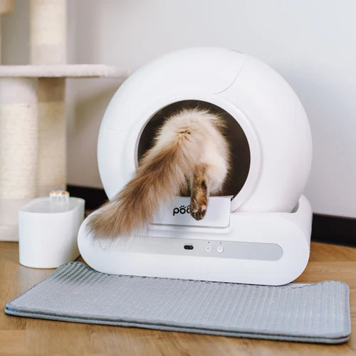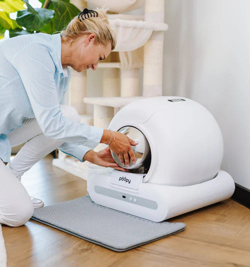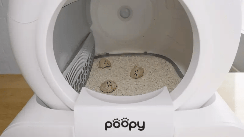 Poopy notices as soon as your cat goes in or out. You set after how many minutes cleaning starts. Safety sensors stop immediately if your cat comes back in.